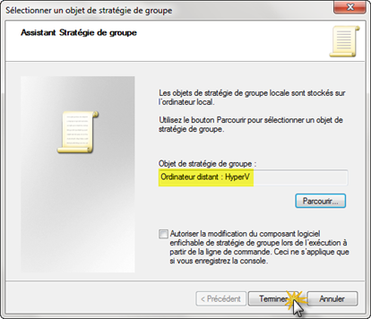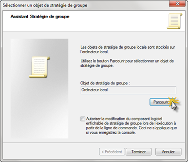 Sur le poste d’administration démarrez une console d’administration (mmc.exe), choisissez d’y ajouter le composant enfichable « éditeur d’objets de stratégie de groupe »