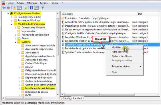Dans cette console, allez dans « configuration ordinateur – modèles d'administration – système – installation de périphériques »
