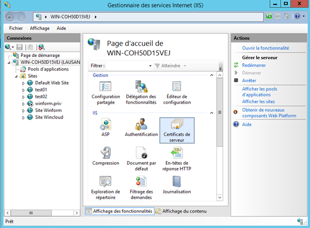 Dans le gestionnaire de services Internet ( IIS ), sélectionnez votre serveur IIS et cliquez sur Certificats de serveur.