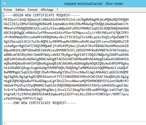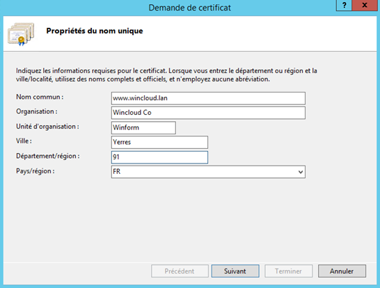 Remplissez les différents champs du formulaire de demande comme vous le souhaitez en veillant à ce que le nom commun ( common name ) reprenne exactement le nom du site , donc ici www.wincloud.lan