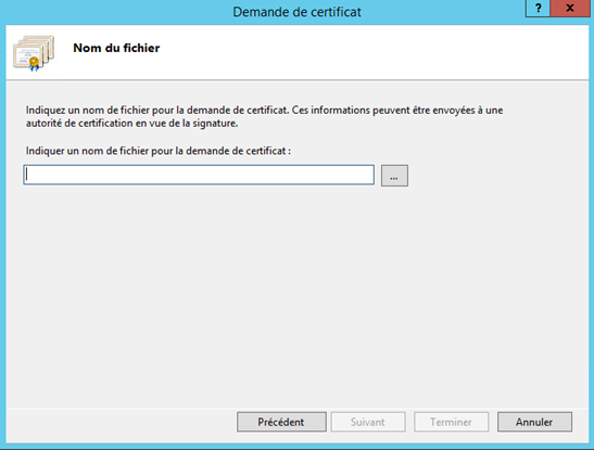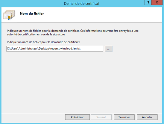 On indique désormais un emplacement et un nom pour le fichier de requête de certificat.