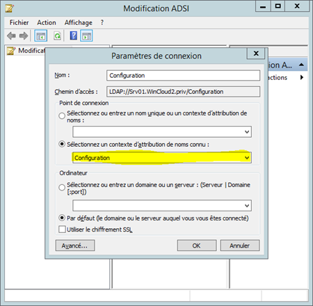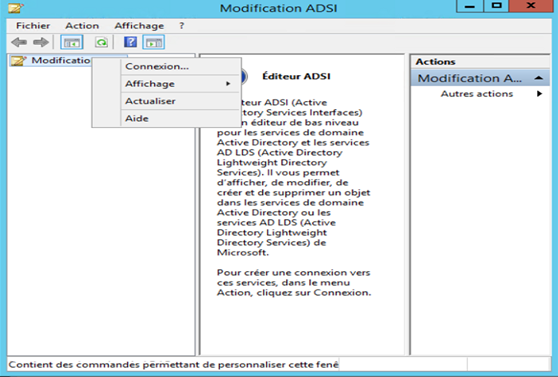 2. Dans ADSI Edit, cliquez avec le bouton droit de la souris sur ADSI Edit dans le volet de navigation, puis cliquez sur Connexion