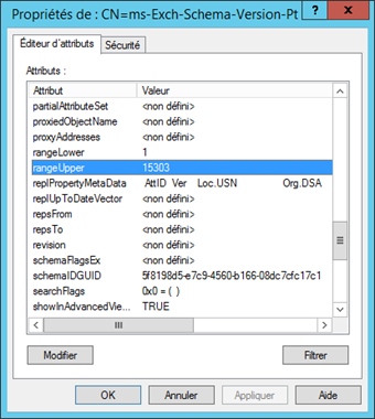 •Dans le contexte d'appellation Schéma, vérifiez que la propriété rangeUpper sur ms-Exch-Schema-Verision-Pt est définie sur la valeur indiquée pour votre version d'Exchange 2013 dans le tableau Versions d'Active Directory dans Exchange 2013.
