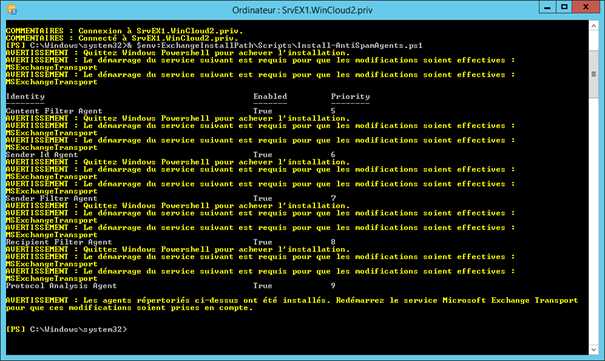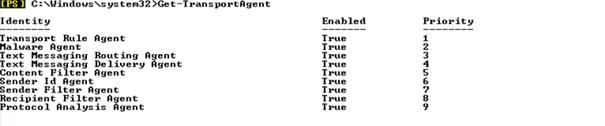 On lance la commande Get-transportAgent pour vérifier les agents installés