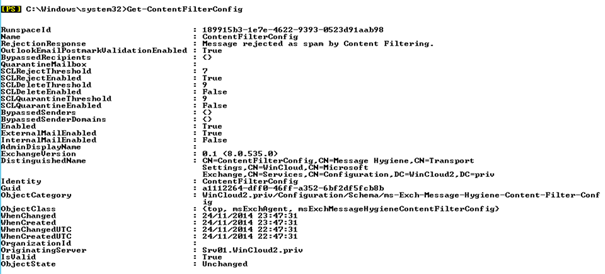 Set-ContentFilterConfig -RejectionResponse "Nous ne pouvons prendre votre message pour des raisons de sécurité votre message n'a pas été accepté"