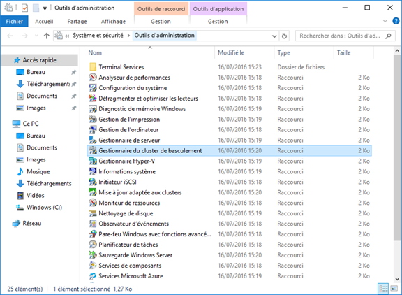 On peut désormais aller dans les outils d'Administration pour lancer la console « Gestionnaire du cluster de basculement ».