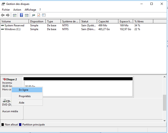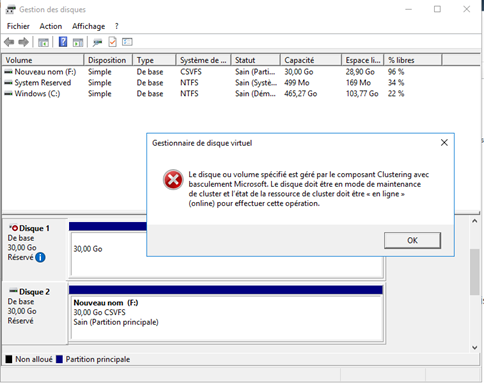 Via le gestionnaire de disque, éventuellement sur tout les nœuds du cluster on s'assure que le disque est en ligne.
