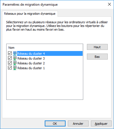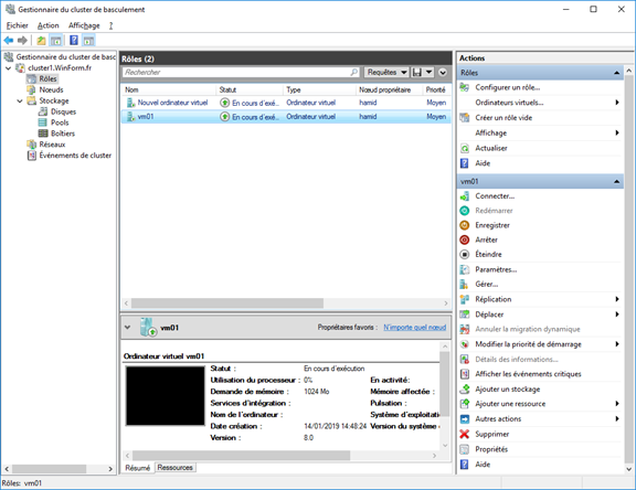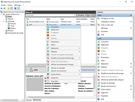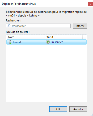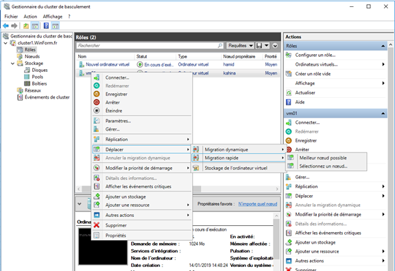 Une fois qu'une machine virtuelle est intégrée dans un cluster, il n'est plus possible de la déplacer à partir du gestionnaire Hyper-V, il faut passer par le gestionnaire de cluster.