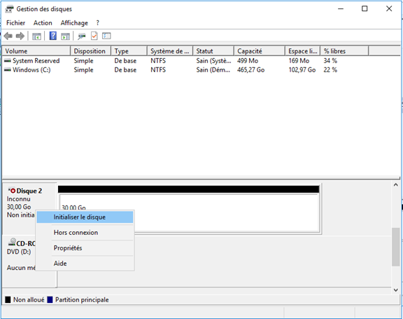 Le disque étant dans notre cas en mode RAW il faut l'initialiser, on décide alors de la passer en GPT ou en MBR.