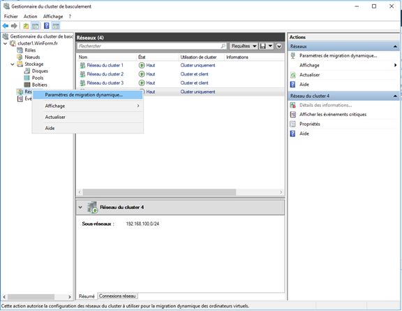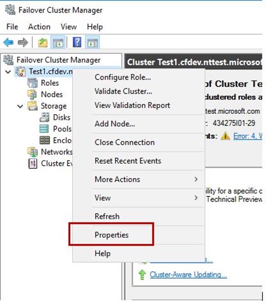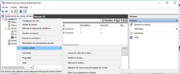 Dans la console de Gestionnaire de Cluster de Basculement on clique sur le Custer puis dans le menu Propriété.