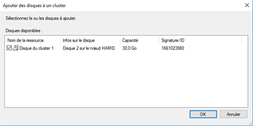 On peut ajouter un disque au cluster à condition que ce soit un disque ISCSI monté sur tous les nœuds du serveur.
