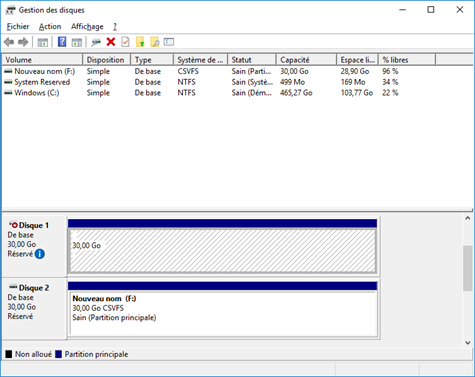 On remarquera également le format du disque est maintenant CSVFS (Cluster Storage Volume Files System).
