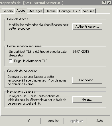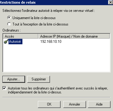 Sur l'onglet Access on lance la configuration des restrictions de relais pour éditer la liste des serveurs autorisés à relayer.