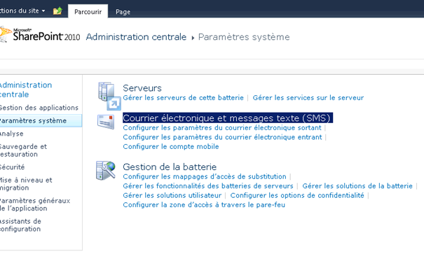 Lancer le site d'administration centrale de SharePoint, puis aller sur la page Paramètres Système et aller sur la rubrique « Courrier électronique et messages texte (SMS) ».
